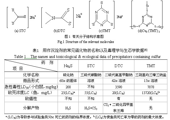 這樣,電路板經堿性蝕刻后產生了大量的含銅清洗廢水和回收尾液。此類廢液偏堿性,NH3較多,銅以較穩定的銅氨絡合物形式存在。采用混凝、中和沉淀、吸附、電解、微生物法等處理方法,難以達到良好的去除效果或處理成本太高。而采用硫化物沉淀法處理含絡合劑的重金屬廢水,由于各種重金屬硫化物的溶度積都非常小,重金屬的去除效果很好。常用的硫化物分無機硫(硫化鈉)與有機硫(STC、DTC和TMT)兩大類,有關分子結構見圖1,它們的生態學及毒理學數據見表1。