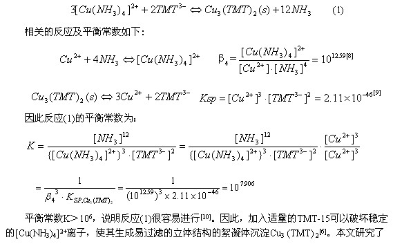 用TMT-15處理含銅氨絡合離子廢水的影響因素,用元素分析、紅外與X衍射等手段表征了生成的沉淀,并對它的熱穩定性與在去離子水中的滲濾特性作了初步探討。
