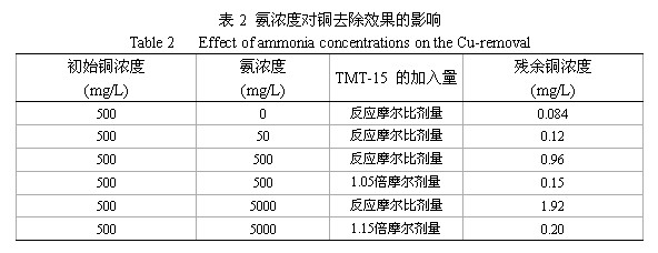 2.1.1  氨濃度對銅去除效果的影響  我們用CuCl2和氨水配制了四種氨濃度不同的溶液各100mL,其中銅離子濃度均為500mg/L,而NH3的濃度分別為0、50、500和5000mg/L。然后按化學反應摩爾比的劑量(TMT與Cu的反應摩爾比為2:3)加入TMT-15,靜置30min后,取上層清液測定剩余銅濃度,結果見表2。從表2中可以看出,在銅的初始濃度與TMT-15的加入量都相同的條件下,溶液中絡合劑氨的濃度越高,處理后的殘余銅濃度也越高,銅的去除率下降。對于這種氨濃度較高的銅氨溶液,為了使其處理后的殘余銅濃度低于0.5mg/L的排放標準[4],我們加大了TMT-15的劑量,以便有足夠多的TMT分子來解離穩定的銅氨絡合離子,試驗結果也列入表2。可見,對于NH3濃度分別為500和5000mg/L的銅溶液而言,當加入TMT的摩爾劑量增加5%與15%時,殘余銅濃度便可降**0.5mg/L以下。