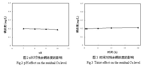 2.1.3  時間對銅去除效果的影響  時間對銅去除效果的影響見圖3。處理前溶液的銅濃度均為500 mg/L,氨濃度為5000 mg/L,初始pH值為8,加入1.15倍摩爾劑量的TMT-15進行處理,在靜置0.5、1、6、12 和24h后分別檢測上清液的殘余銅濃度,試驗結果見圖3。從圖中可見,反應0.5h后,TMT已完全將銅從穩定的絡合物中解離并沉淀下來,靜置24h后的殘余銅濃度依舊維持在同一低水平;這些結果均說明TMT與銅氨絡合物的沉淀反應速度快,而且沉淀物在溶液中沒有出現再溶解現象。