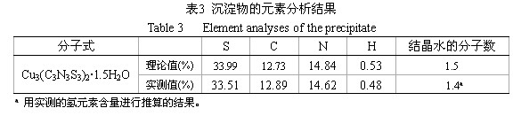 2.2.1  元素分析  我們將制備的沉淀物進行元素分析,結果見表3,試驗數據表明獲得的沉淀的分子式與Cu3(C3N3S3)2•1.5H2O基本一致。