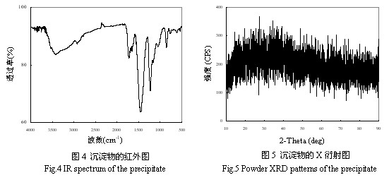 2.2.3  XRD圖的分析  圖5為沉淀產物的X射線衍射圖。圖中均為彌散的散射區,無明顯的衍射峰,表明生成的沉淀為非晶體。
