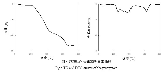 2.2.4  熱重分析  我們同時對沉淀產物進行了熱重分析,它的TG和DTG曲線見圖6。從圖中可見,沉淀物的熱穩定性較高,它的分解在200℃左右才開始,680℃時結束,總失重為51.5%;在它的差熱曲線上呈現了三個明顯的吸熱峰,對應的溫度分別為257、391和628℃,這說明沉淀物的熱分解過程是復雜的,可能沉淀物在失去結晶水的同時,也開始了分解[15,16]。