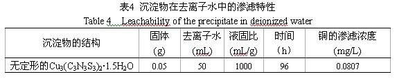 同時我們也對生成的沉淀物進行了研究。研究表明,沉淀物為非晶態的Cu3(C3N3S3)2•1.5H2O,其中結構中的均三嗪環處于共軛的硫醇狀態,銅離子分別與硫成鍵。熱分析結果表明,沉淀物的熱穩定性較高,它的熱分解過程是復雜的,可能在200℃開始失去結晶水的同時,也出現了分解現象。而滲濾試驗表明,沉淀物在去離子水中滲濾出的飽和銅濃度很低,因此當生成的污泥在填埋場遭雨水淋瀝時,也不會對環境造成重金屬的二次污染。