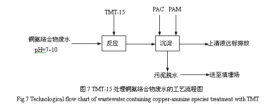 從以上結果可知,TMT能與銅離子強力螯合并沉淀,處理含銅氨絡合物廢水的效果好;而且它的處理方法簡單,只要添加藥劑即可除去銅離子,不用增加設備費用。
