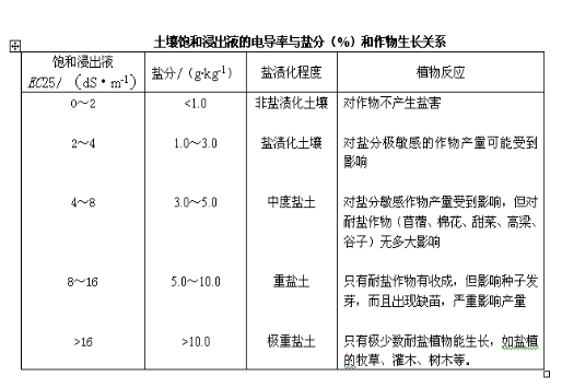 可以作為確定鹽漬土類型和鹽漬化程度的依據,對于改良鹽漬土具有重要意義。在使用此數據確定各項指標時,地區性很強,應結合土壤類型、質地、土層結構、排水性、氣候、作物等情況綜合考慮。#p#分頁標題#e#