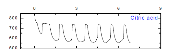 (1) 用0.45M丁二酸、0.45M乙二酸、0.45M檸檬酸代替丙二酸后,僅有蘋果酸、檸檬酸可以觀察到振蕩現象,乳酸沒有振蕩現象但是出現異?,F象。
